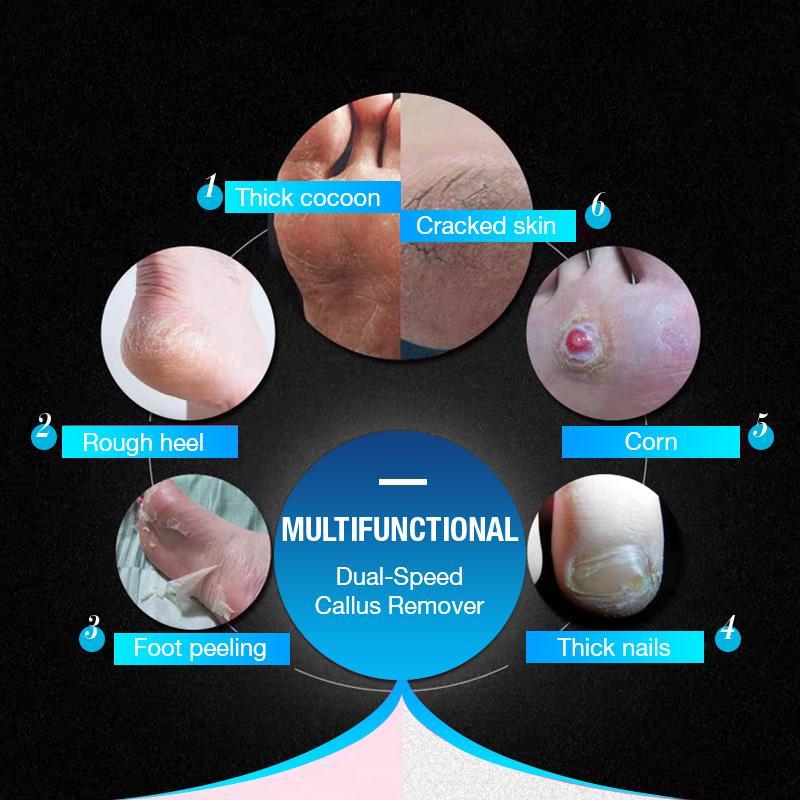 - INSTANT RESULTS:Watch in amazement as our electric callus remover for feet blasts through dead skin and hard-to-remove calluses. revealing smooth skin ¨C and with a built-in vacuum. there's no mess!With you'll no longer have to suffer dry cracked heels in-between visits. Now you can have pedicure-worthy feet Whenever you want.